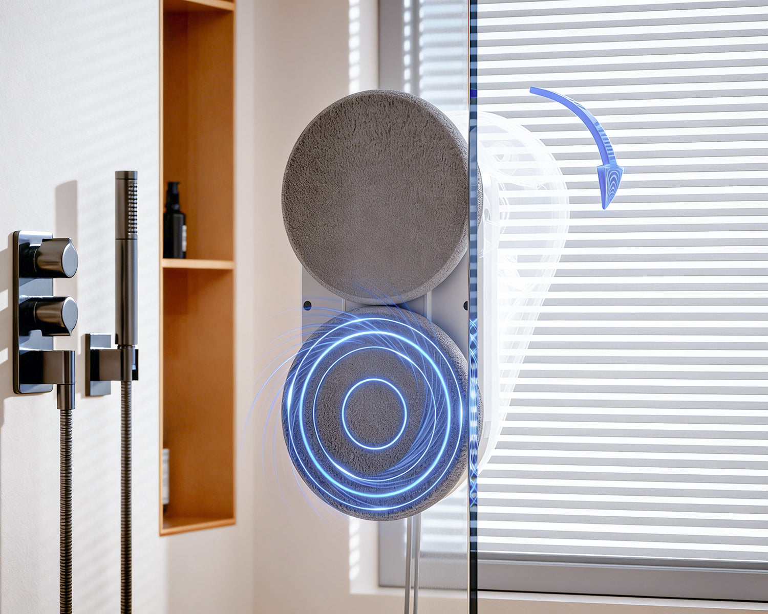 The two discs rotate synchronously, simulating a "symmetrical wiping with both hands." In doing so they exert an even pressure of 55 N on the glass and remove water spots and dirt through targeted cleaning.