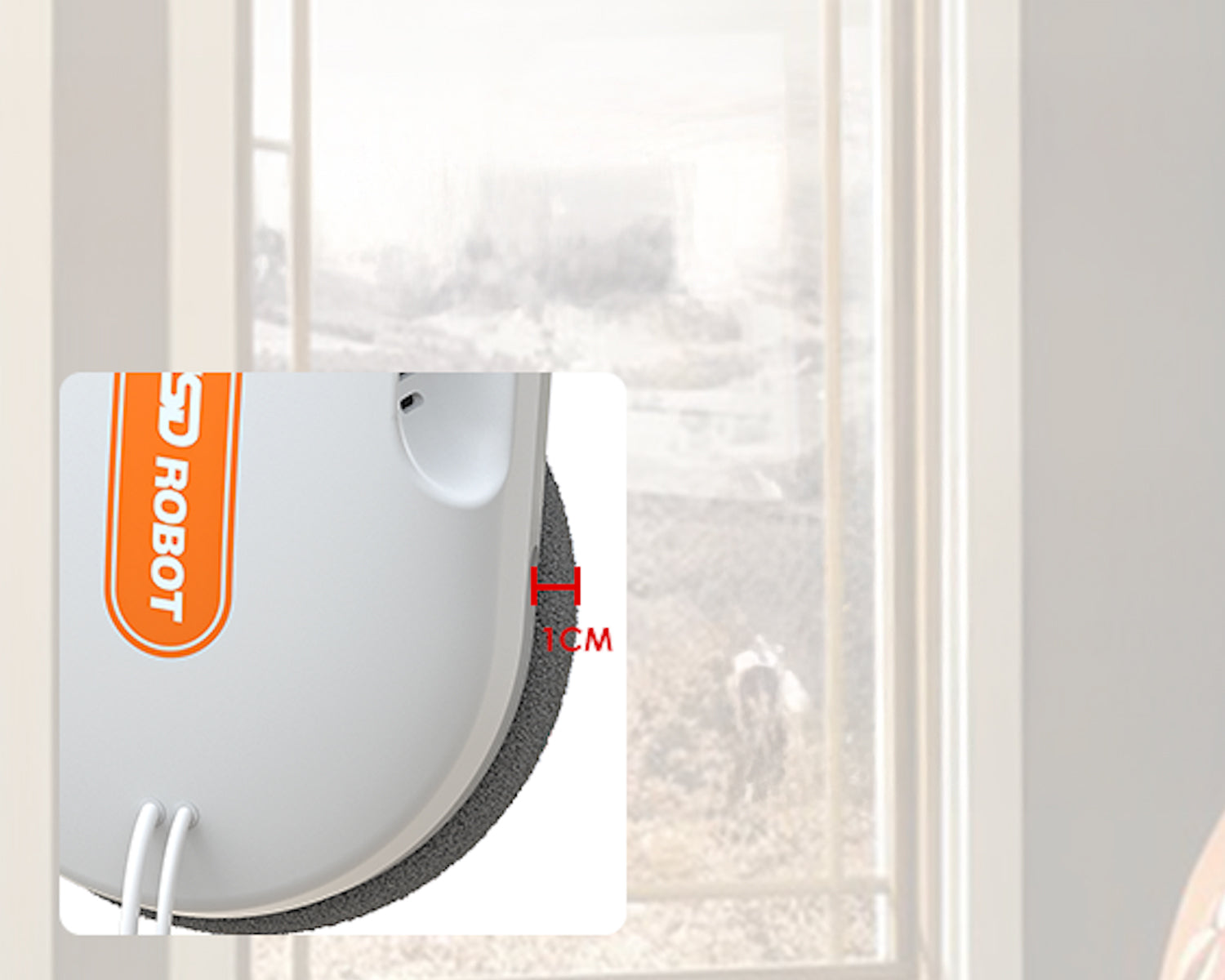 Most square robots, due to the sensor arrangement on the outer ring, naturally leave an area of about 1 cm at the window frame untouched. The two discs of the JSDROBOT are 1 cm wider than the housing. This allows the cleaning cloth to reach the window frame when cleaning the edges and ensures an almost complete clean without missed spots.